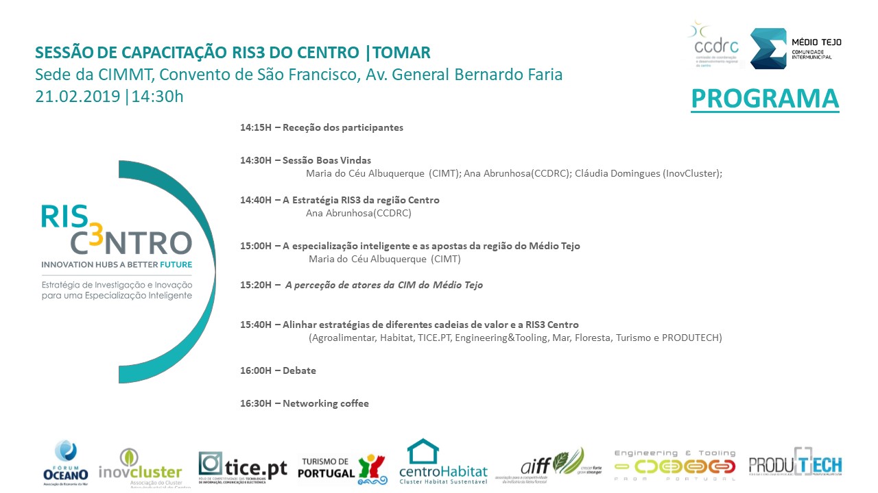 Inscreva-se na Sessão de Capacitação RIS3 2020 do Centro! Dia 21 de Fevereiro às 14:30H, na sede da CIMMT, Convento de São Francisco, Av. General Bernardo Faria, em Tomar. Trata-se de mais uma iniciativa no âmbito da Estratégia de Investigação e Inovação para uma Especialização Inteligente (RIS3) do Centro.